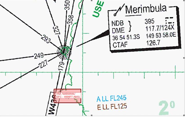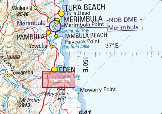 TRA ‘NARWHAL’ may affect the use of the Merimbula Instrument Approach Procedures (IAP) and their associated missed approach paths. An assessment of IAP will be sought, with the outcome to be promulgated in AIP SUP.