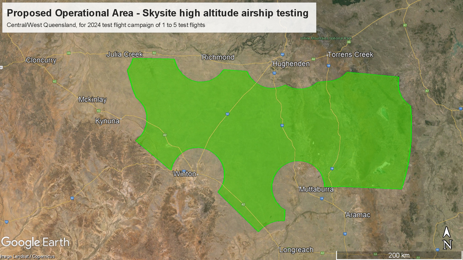 We are planning our 3rd of up to 5 test flights of an experimental stratospheric airship, designed to operate above 60,000 feet. Test flights will be conducted in the vicinity of the Mitchell Grass Plains between Winton and Hughenden and North of Longreach, Queensland. Please refer to the image below for the operational area.