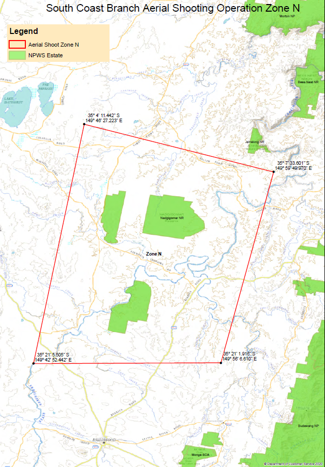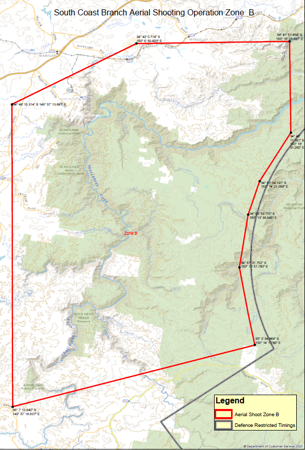 The aerial shooting operations will be conducted within NPWS land tenure and specific adjoining private properties, near Nowra restricted air space, performing low flying operations that target pest animals. The crew consists of a Pilot, Navigator, Shooter and an on-ground Officer-in-Charge maintaining flight following for search and rescue purposes.