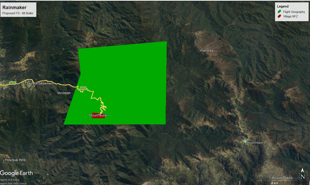 Rainmaker is an American precipitation enhancement company that is engaging in RPAS research and development operations in Australia. Rainmaker is seeking to add a BVLOS area approval to their Remotely Piloted Aircraft (RPA) operations to allow the testing of their RPA and adjacent technology from Mt. Buller. Rainmaker currently holds a Remotely Piloted Aircraft Operator's Certificate (ReOC). Rainmaker conducts similar BVLOS activities in the USA.