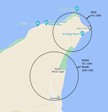 | YMMM/R125B North West Cape RA3 | 4.56 n mile circle radius | 1500 ft AMSL - FL135 | H24 | |