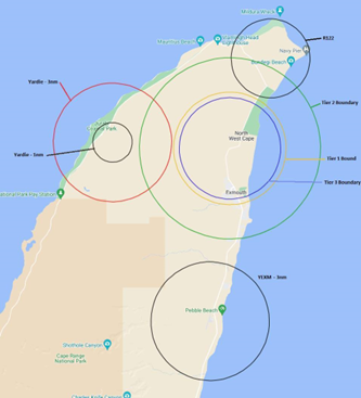 | YMMM/R122 North West Cape RA3 | 2 nautical mile (n mile) circle radius of: