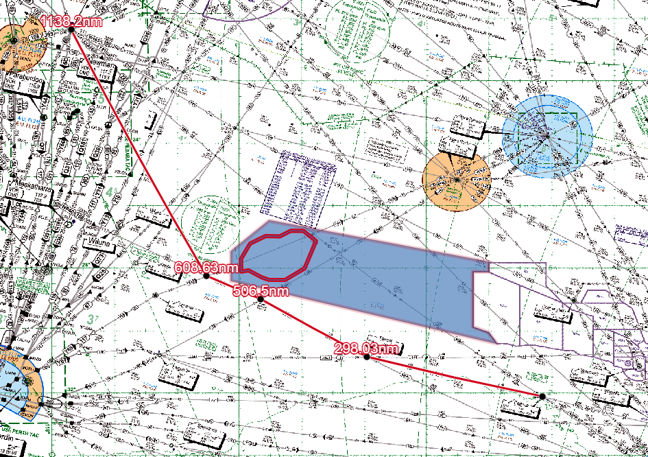 Additionally, the Restricted Area between Laverton Shire and the WRX will allow continued use of N640. Diverting around the RAs Ceduna to Port Headland is 1136 nautical miles (n mile), compared to 1074 n mile via A585.