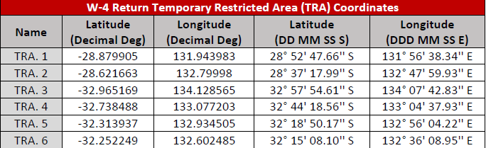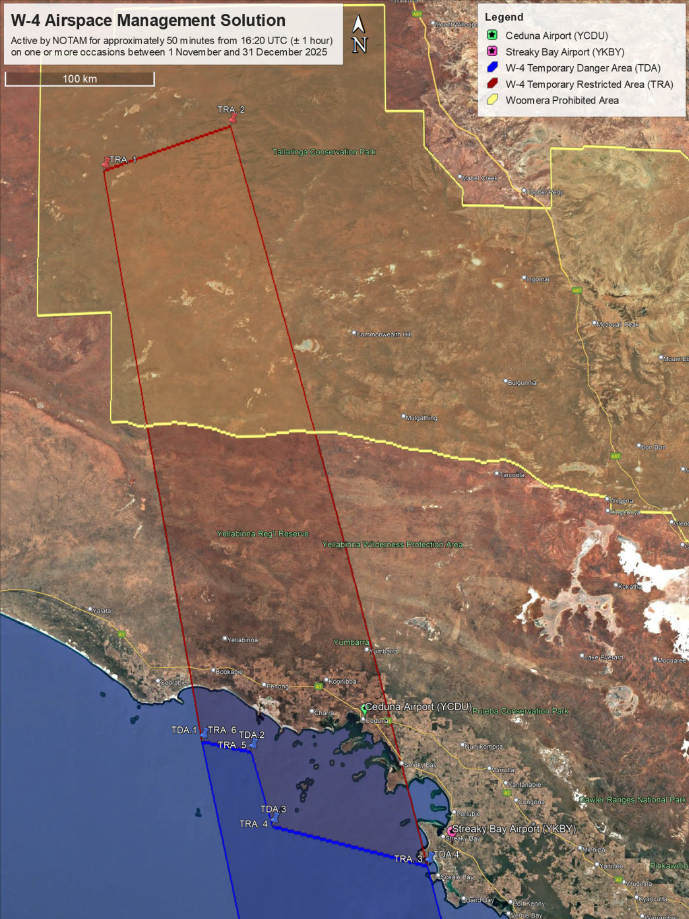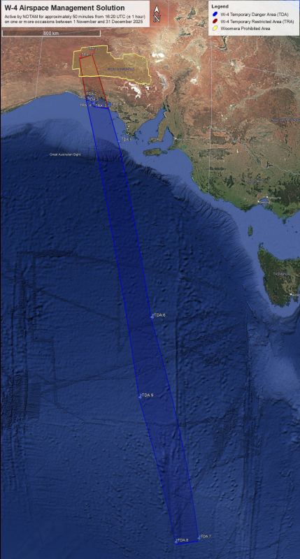 The W-4 satellite re-entry to Koonibba Test Range, SA. The declaration of a large TRA and TDA to support safe separation during a period of approximately 50 minutes from 16:20 UTC (±1 hour) on notified occasions between 1 November and 31 December 2025.