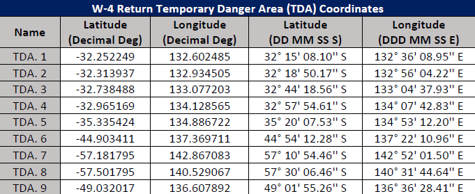 Please refer below for the coordinate boundary of the proposed TRA/TDA and supporting imagery of the hazard areas. Stakeholders familiar with the airspace solution employed for the W-3 re-entry on 14 May 2025 are advised that the hazard areas for this activity extend approximately 830 nautical miles further south.