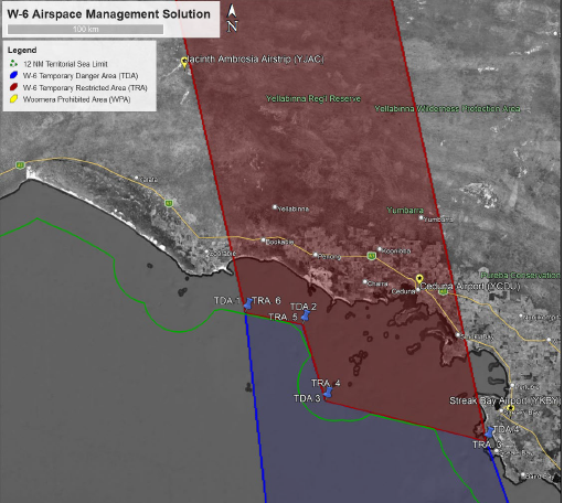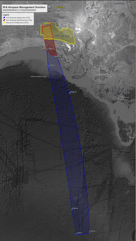 The TRA will be supplemented by a TDA, established to extend from the TRA further southward over the ocean and encompass the hazard area beyond Australian territory, as defined by the 12-nautical-mile territorial sea boundary. The TDA will be active during the same period as the TRA, and aircraft operators are advised to plan around the area during this time. Airservices Australia will serve as the contact for the TDA.