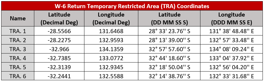 W-6 satellite re-entry to Koonibba Test Range, South Australia. The declaration of a large TRA and TDA to support safe separation during a period of approximately 60 minutes from 05:00 UTC (±2 hours) on one or more occasions between 15 April and 15 June 2026.