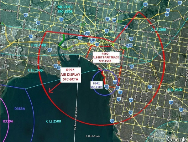 This request has previously resulted in the establishment of two TRAs. One smaller TRA (R990) which is localized around Albert Park Lake itself extending to the edge of the Port Phillip Bay coastline and doesn’t impact on the Port Phillip Bay coastal Day VFR route. R990 is proposed to be surface to 1500 feet and would be in place between 08:00 and 18:30 local time. R990 does impede on the Point Ormond Danger Area of which the operator of sky diving aircraft and Professional Helicopter Services implement procedures for continued operations for the duration of the event.