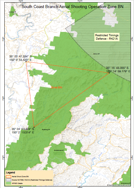 The aerial shooting operations will be conducted within NPWS land tenure and specific adjoining private properties, near Nowra restricted air space, performing low flying operations that target pest animals only.